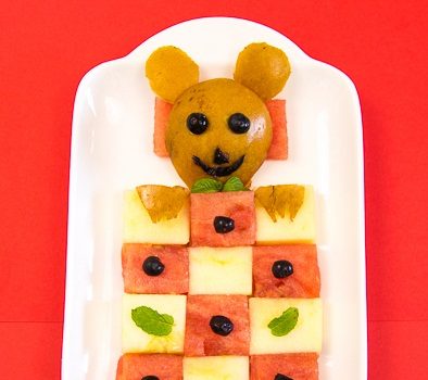 · اقطعى الفاكهة إلى مربعات أو مكعبات ورصيهم فى طبق التقديم بالتوالى ( البطيخ – التفاح ) ليكون جسم لعبة المرح كما هو موضح بالصورة . · اقطعى الكمثرى من احدى الجوانب لتعطى شكل الرأس واستخدمى الجلد فى عمل الأذنين...