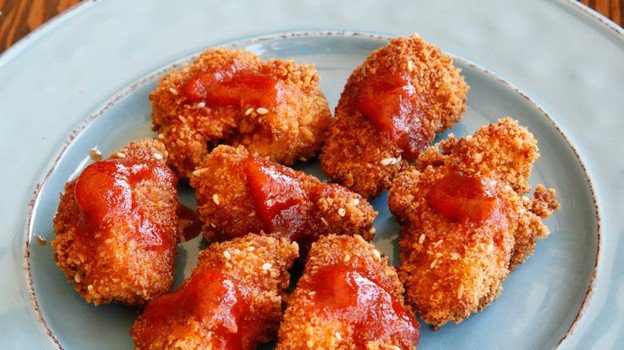 · قطعي صدور الدجاج إلى قطع صغيرة ( مقياس 1 – 2 بوصة )، باستخدام مقص تقطيع اللحوم أو سكين حاد ثم تبيهم بالملح والفلفل. · اخفقي البيض مع 1 ملعقة صغيرة ماء في وعاء متوسط الحجم، امزجي البقسماط والسمسم...