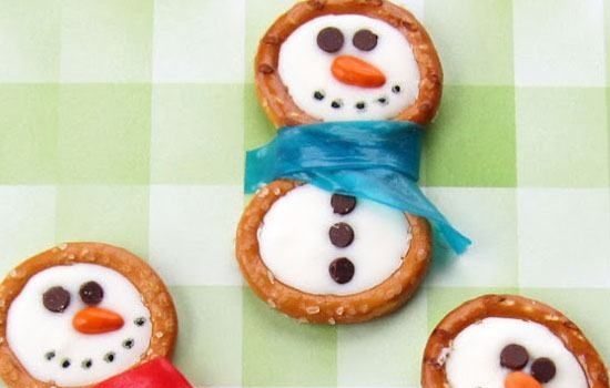 - افردي شرائط الحلوى الملونة في صينية خبز مبطنة بورق الزبدة ثم ضعي قليل من الشوكولاتة البيضاء المذابة في منتصف الشريط، ثم قومي بلصق حبتين من البريتزل، كما هو موضح بالصورة. - املئي دوائر البريتزل بالشوكولاتة.- شكلي ملامح سنو مان...