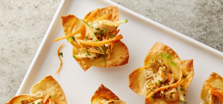 · في وعاء صغير، اخفقي المايونيز وصوص الصويا وعصير الليمون وصوص سريراتشا والثوم المفروم ثم أضيفي هذا الخليط على الدجاج المطبوخ وقلبي. · قطعي الجزر والخيار والبصل إلى شرائح رقيقة وأضيفيهم إلى الدجاج وقلبي. · وزعي شرائح الوانتون في أكواب...