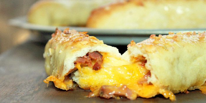 -اخفقي بخفاقة العجين الدقيق مع الزبدة والبيكنج باودر ورشة الملح والفلفل حتي تصبح العجينة مفتتة كالرمل .-اضيفي الماء إلي العجين واستمري بالخفق حتي تصبح العجينة لينه . -اتركي العجينة ترتاح قليلا ثم نقطعها شرائح ونحشوها بمقدار بسيط من جبن الشيدر...